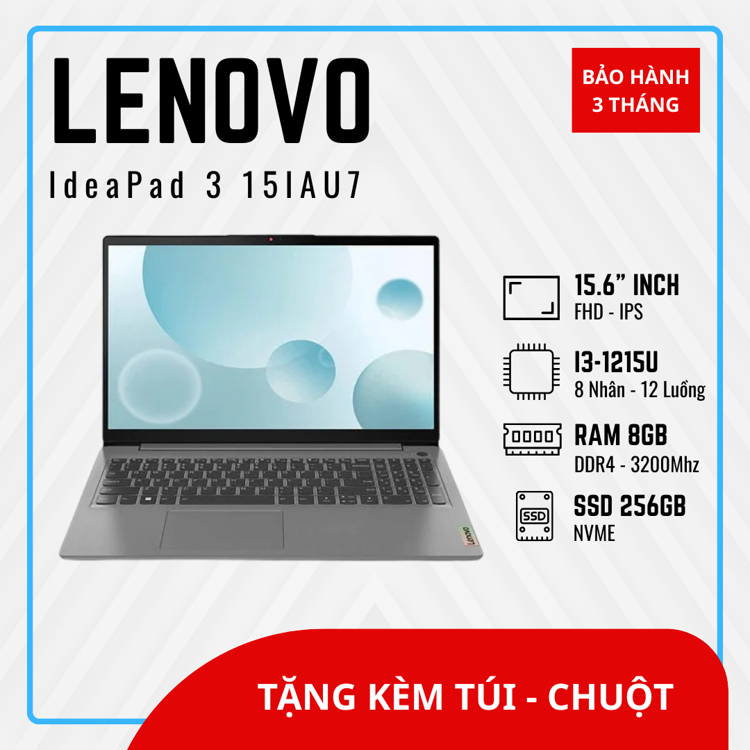 Lenovo IdeaPad 3 15IAU7 là mẫu laptop phổ thông, phù hợp cho nhu cầu học tập và làm việc văn phòng cơ bản. Máy được trang bị CPU Intel Core i3-1215U, dòng chip thế hệ 12 tiết kiệm điện năng, đủ sức xử lý các tác vụ thường ngày như Word, Excel, PowerPoint và duyệt web.