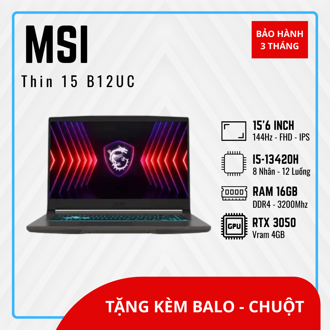 MSI Thin 15 B12UC là mẫu laptop gaming mỏng nhẹ, phù hợp cho game thủ cần một thiết bị hiệu năng tốt nhưng vẫn dễ dàng mang theo. Máy được trang bị CPU Intel Core i5-13420H, dòng chip thế hệ 13 với hiệu năng ổn định, giúp xử lý tốt các tựa game phổ biến và công việc đa nhiệm.